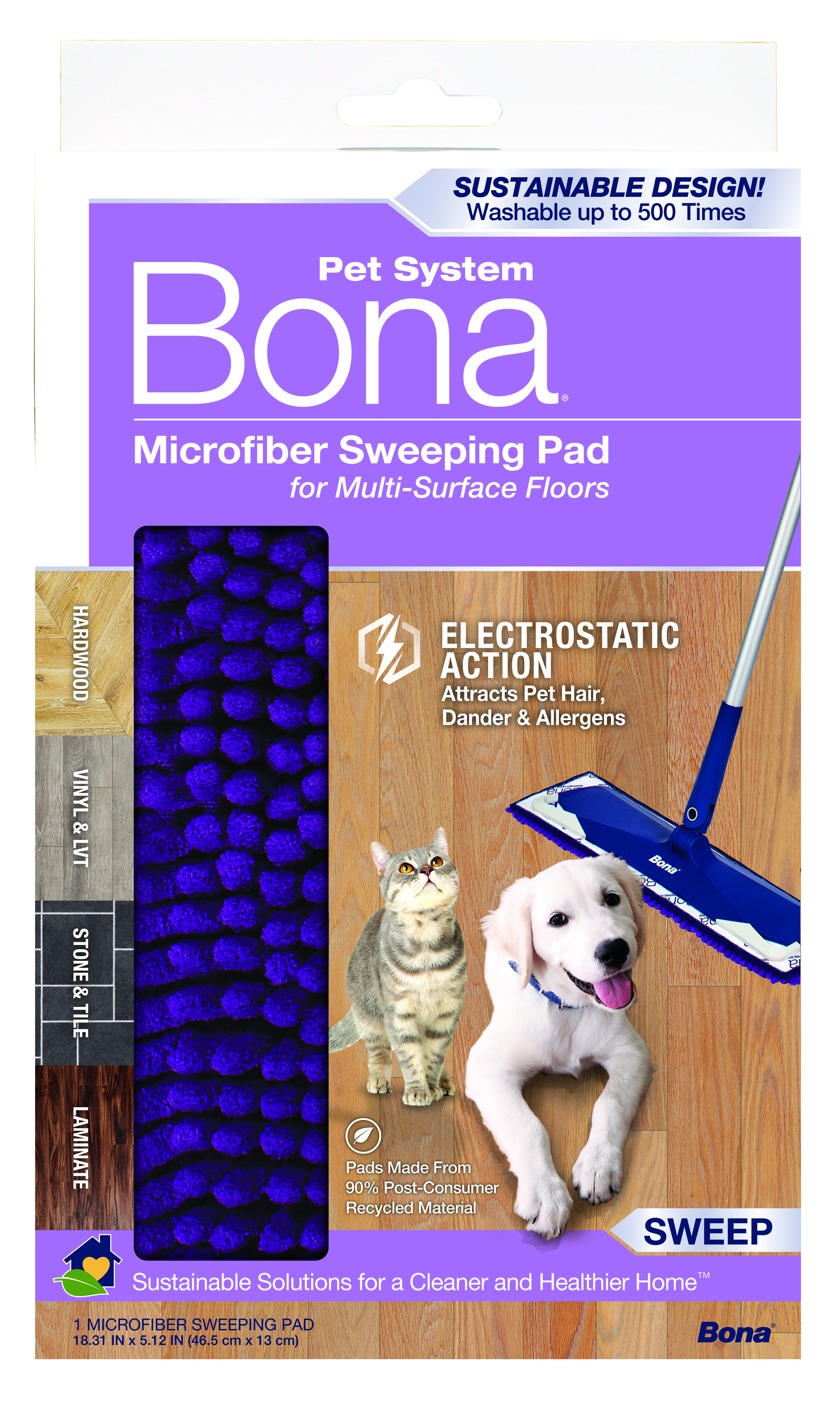 Relax. Bona makes it easy to care for your floors. The Bona Pet System Microfiber Sweeping Pad is the must-have accessory for pet mess clean-up on your floors. The pad works through electrostatic action and specially designed microfiber “fingers” that pick-up pet hair, fur, dander and allergens. Love your floors with Bona. Sustainable solutions for a cleaner and healthier home.